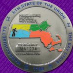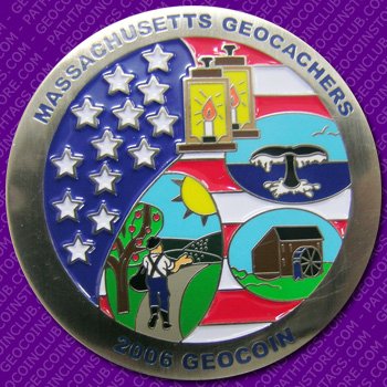 This unique coin is produced through the Geocoin Store by a group of Massachusetts cachers. The design of the coin incorporates many historical elements from this great state. From Johnny Appleseed to the lanterns to be hung in steeple of the Old North Church to signal the arrival of British troops during the American Revolution.