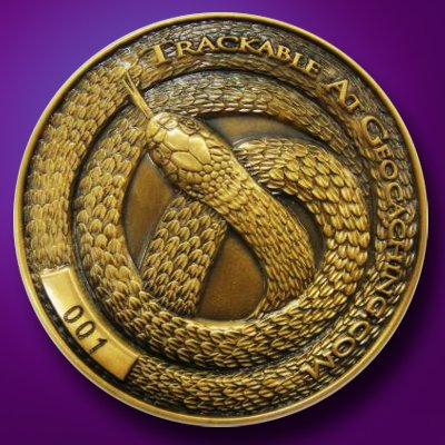 Cache Critters - we've all seen them out on the trail. Sure - our critters are different depending on what corner of the world we are caching in... but they are still there. This coin depicts two of the most notorious. First a snake coiled up. The scales were intricately hand detailed by Chris Mackey and produced in stunning 3D detail. The spider on the opposite side is vibrantly colored. And epoxy coating keeps him safely separated from the coin handler. The snake? Well - you'll just have to take your chance handling the snake. ;)
