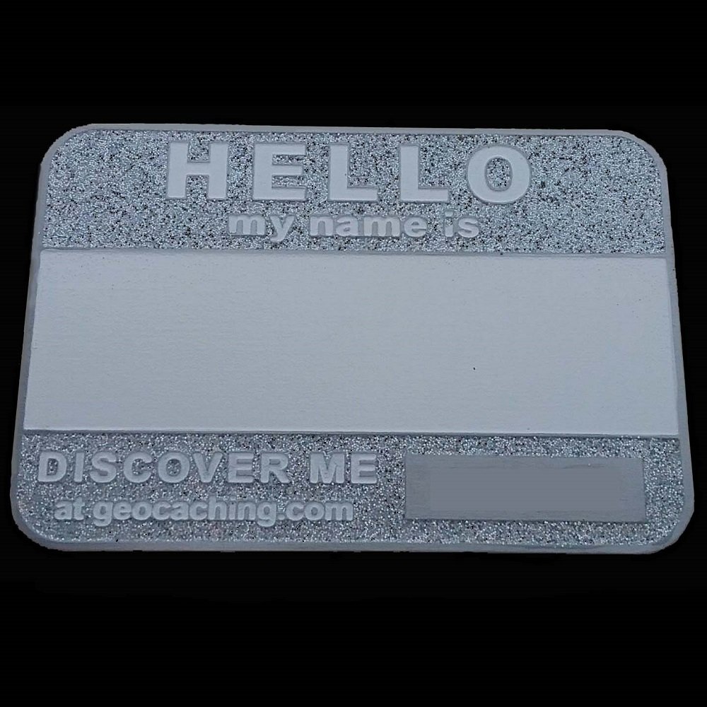 The Geocoin also feature a large, blank, white area for writing your name. Use a black sharpie (not included, sorry!) to permanently display your name in high contrast for easy reading.