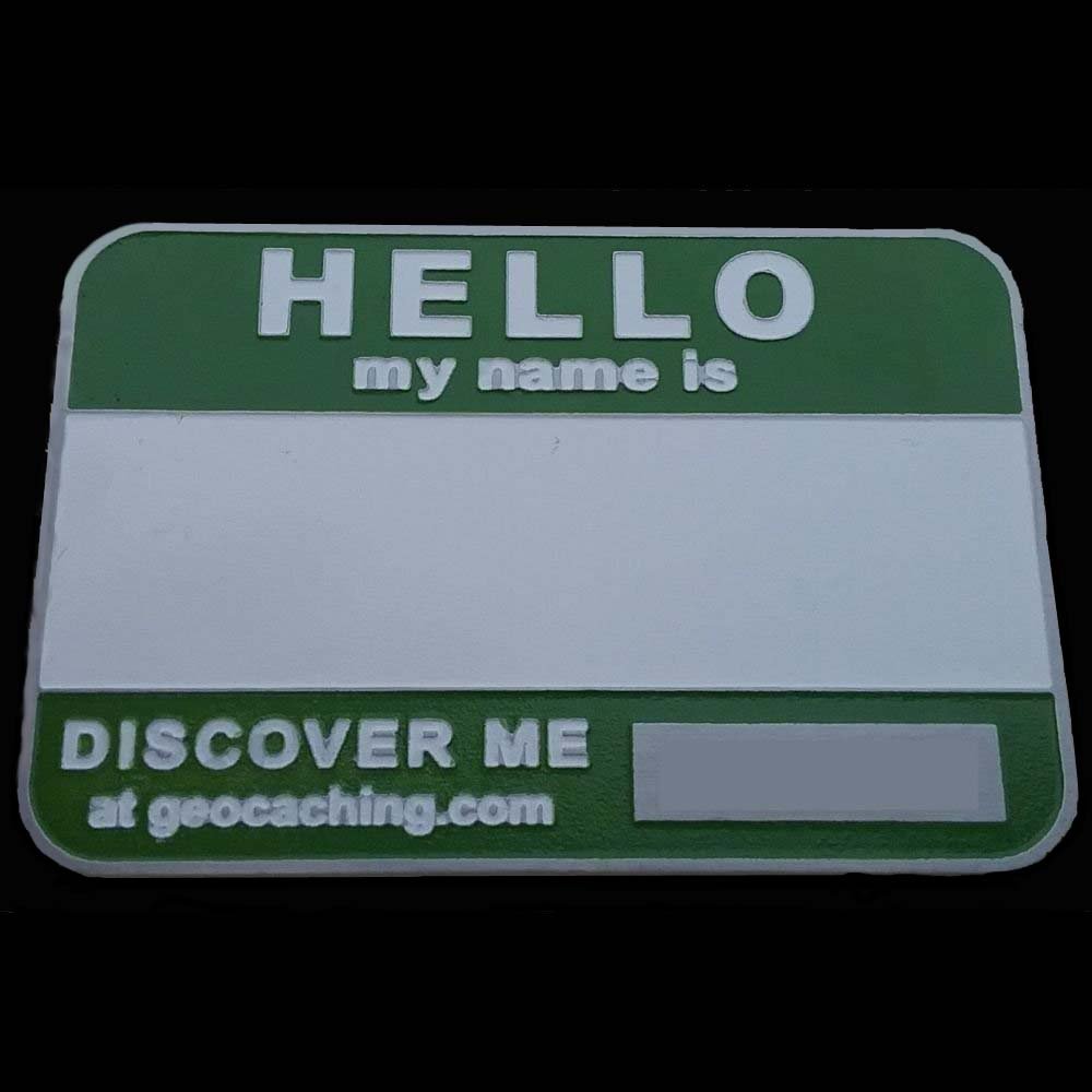 The Geocoin also feature a large, blank, white area for writing your name. Use a black sharpie (not included, sorry!) to permanently display your name in high contrast for easy reading.