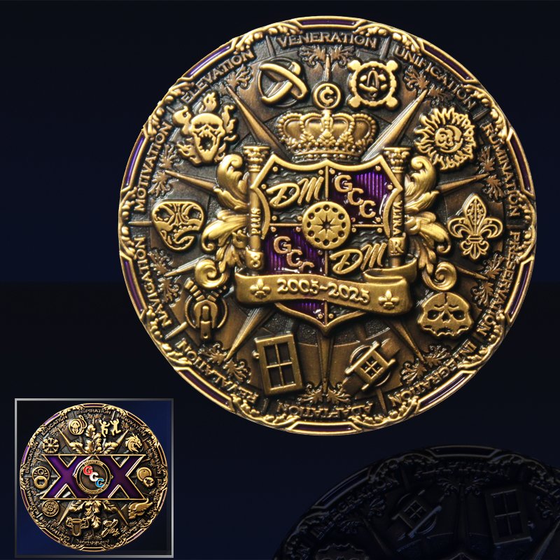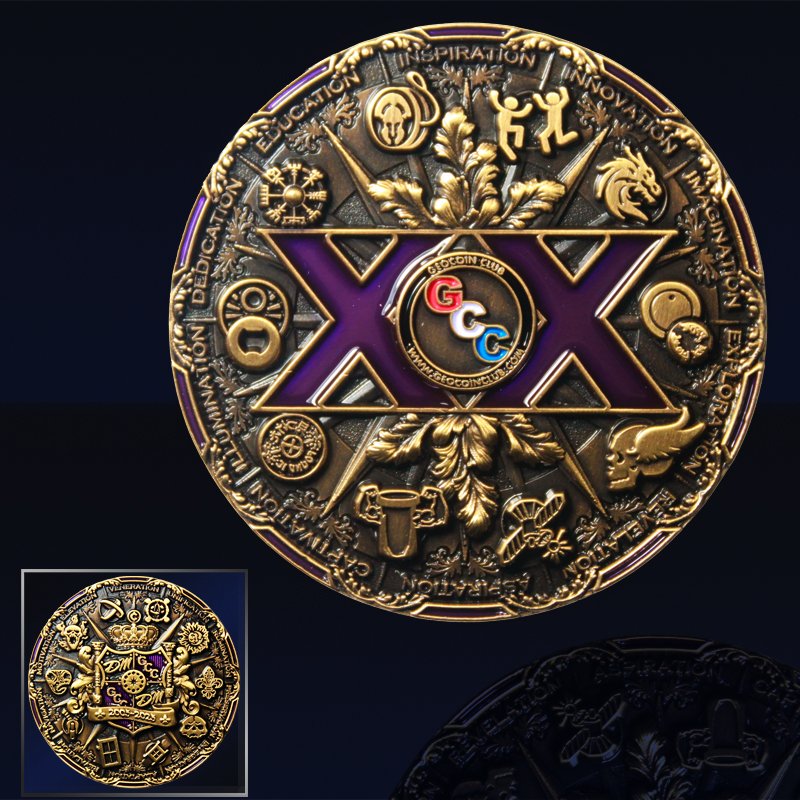 Side A hosts the GCC logo and the roman numeral 20 surrounded in 3d flourishes and royal purple on gold.