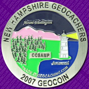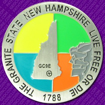 The 2007 New Hampshire coin features a lot of elements that are "must sees" in the Granite State. On one side you have Mt. Washington and the Portsmouth lighthouse. On the other side, GC9E - the oldest cache in New Hampshire is accompanied by the oft recited state motto "Live Free or Die" and the revered Old Man of the Mountain, may he rest in peace.