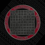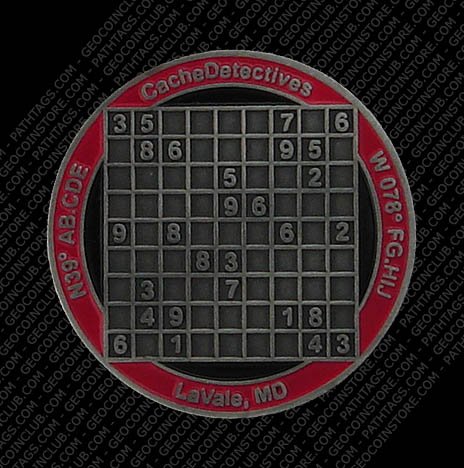 The back of the coin features a Sudoku puzzle. By using the numbers on the coin and the letters shown on the cache page, you will be able to find the CacheDetectives’ Coin Challenge Cache (GCWEC0). It is located in the Cumberland, Maryland area.