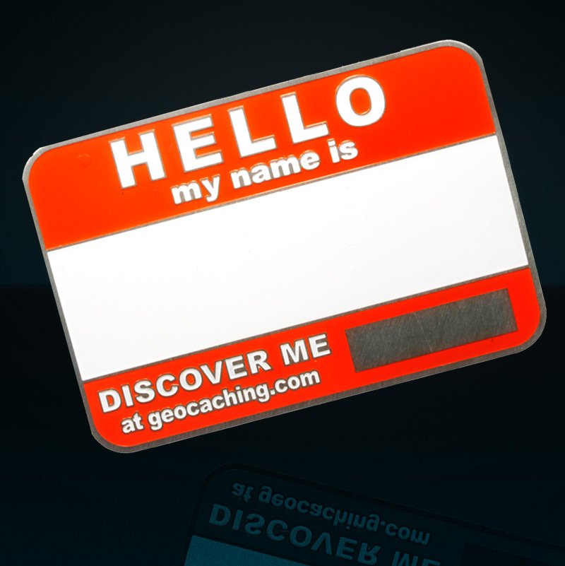 The Geocoin also feature a large, blank, white area for writing your name. Use a black sharpie (not included, sorry!) to permanently display your name in high contrast for easy reading.