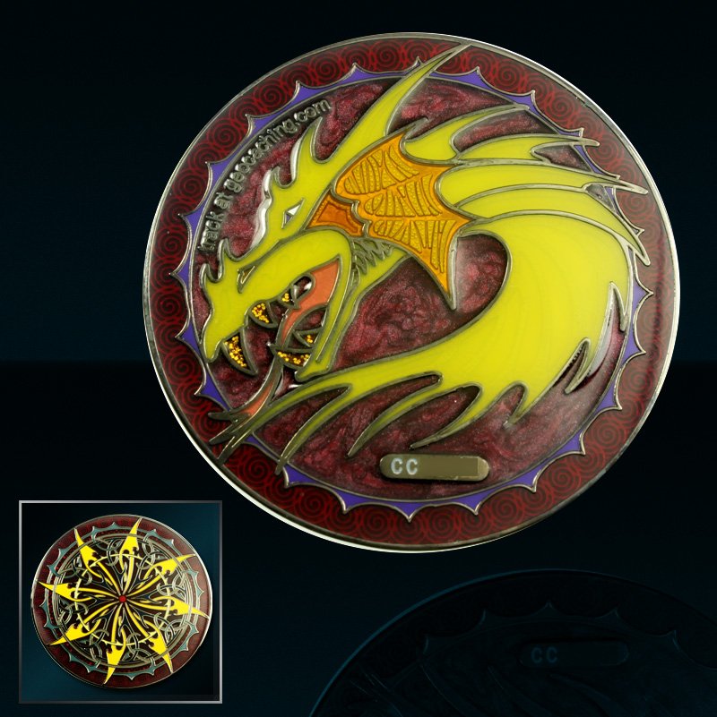 A customer design from NepoKama and Mekle.  These two really knocked it out of the park on this one.  The Dragon on the front is multi layer, super detailed, and really shines.  The tails on the back form an intricate spiral pattern.