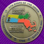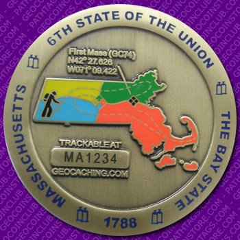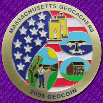 This unique coin is produced through the Geocoin Store by a group of Massachusetts cachers. The design of the coin incorporates many historical elements from this great state. From Johnny Appleseed to the lanterns to be hung in steeple of the Old North Church to signal the arrival of British troops during the American Revolution.